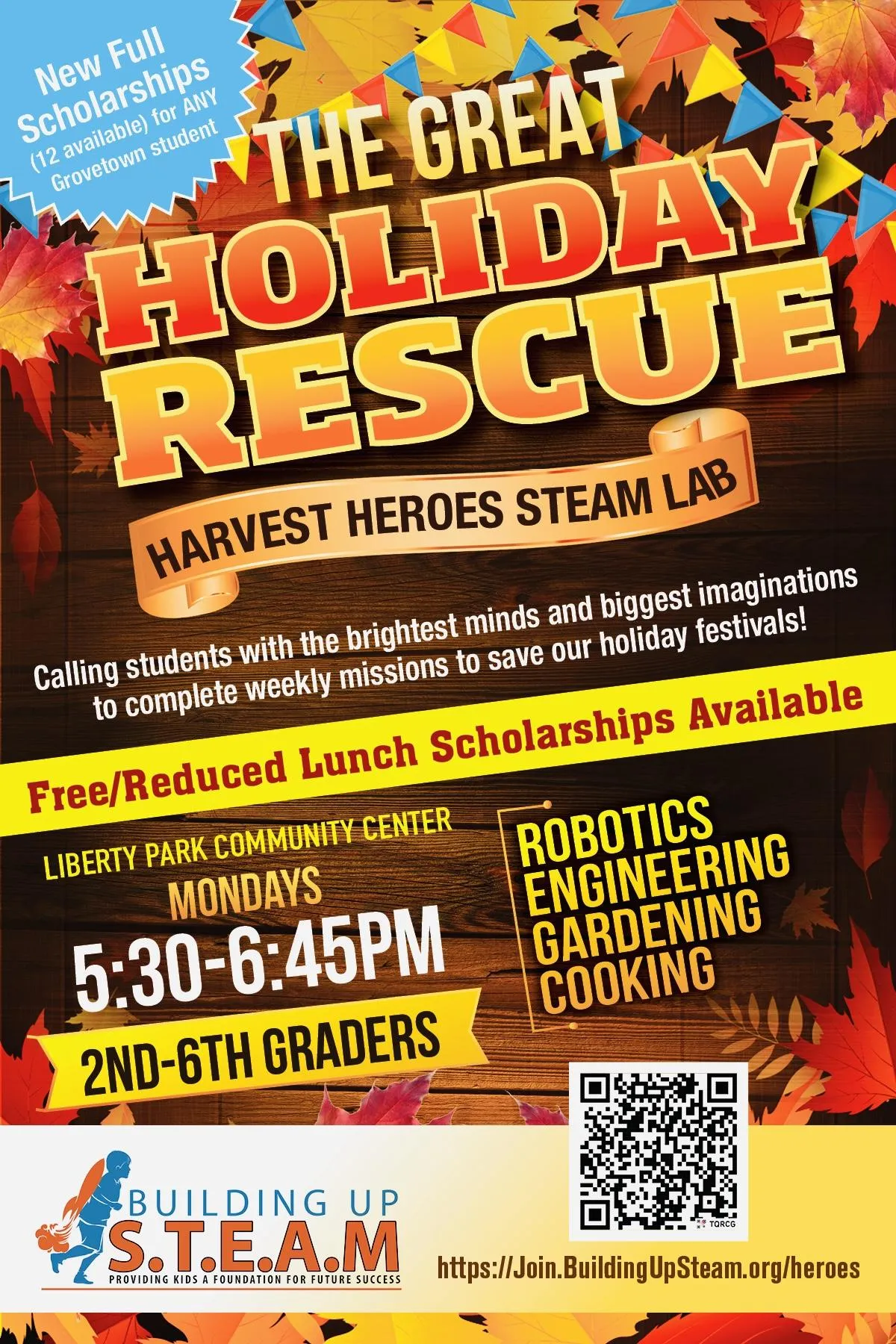 This fall, the holidays are in danger—and only the Harvest Heroes can save them. Somewhere between pumpkins, turkeys, and twinkling evergreens, a series of mysterious challenges threatens to derail the season’s festivities. That’s where your student comes in. Armed with Science, Technology, Engineering, Arts, and Math, students will train as problem-solvers and innovators, uncovering clues, building solutions, and working together to restore holiday cheer. Each week brings a new twist in the story, pushing our heroes to think critically, work collaboratively, and persevere through adversity until the season is saved. The mission is urgent, the stakes are high, and the spirit of the season depends on the imagination and determination of our Harvest Heroes.